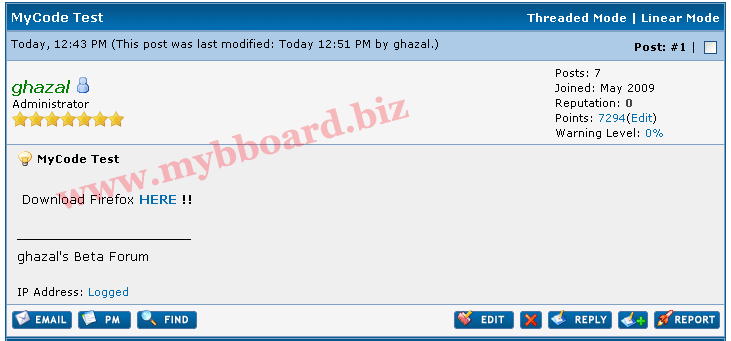 //MYCODE OVERVIEW: //---------------- Name: Anti IE Redirect BBCode Author: ghazal Description: With the Anti IE Redirect BBCode you can post content that Internet Explorer users cant read and then redirect users to FireFox Download page. Website: http://www.mybbcodes.com Author is Responsible For Any Damage: NO Author Provide Support For This Product: YES Copyrighted: All codes within the product is strongly copyrighted. //------------ //SCREENSHOTS: //------------ //---------- // DOWNLOAD: //---------- ![]() //-------- //SUPPORT: //-------- I can be reached at http://www.mybbcodes.com with username ghazal --- I guess that's it... Enjoy Thank You ghazal |